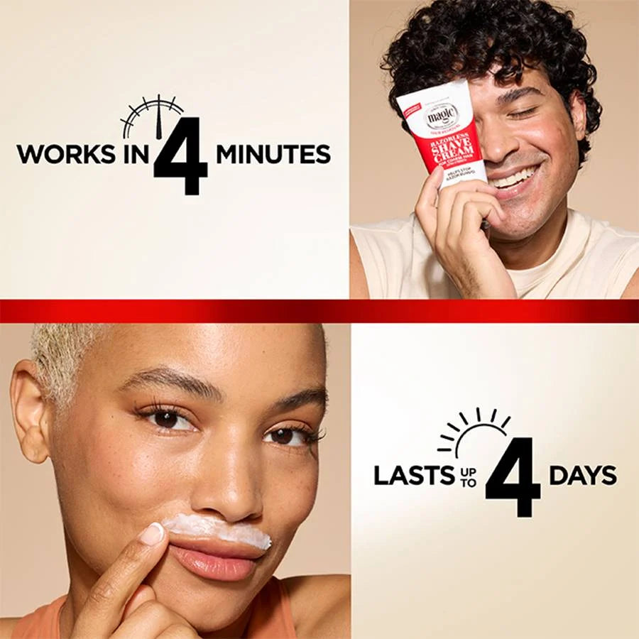 Magic Shave Cream Extra Strength offers an effective, razorless solution. The formular softens hair in just 4 minutes, allowing for a closer shave while reducing razor bumps. Enhanced with shea butter and sweet almond oil, it nourishes and moisturizes the skin, leaving it smooth and refreshed with a light, fresh scent. Expect hair-free results lasting up to 4 days with this expert-formulated cream.